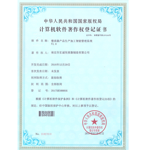 計(jì)算機(jī)軟件注冊(cè)權(quán)登記證書——整流器產(chǎn)品生產(chǎn)加工智能管理系統(tǒng)V1.0